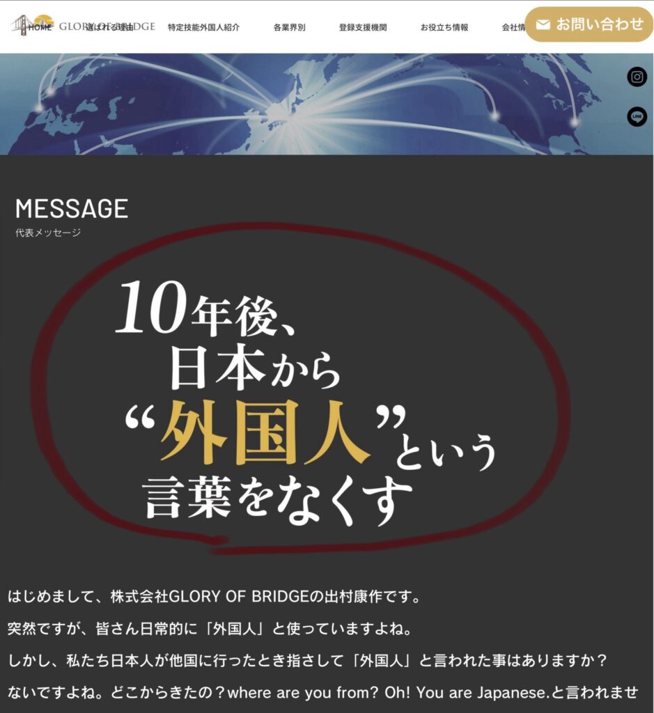 これ、どこかの理想主義者が語った夢物語ではありません。GLORY OF BRIDGEという外国人労働者支援団体のトップが掲げる、れっきとした「代表メッセージ」なんです。