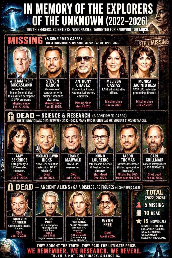 2022年から2026年――わずか4年の間に、UAP(未確認航空現象)、古代宇宙人理論、そして最先端の航空宇宙研究に携わった専門家たちが、驚くべきペースで姿を消したり、命を落としたりしています。確認されているだけで行方不明5名、死亡10名。合計15名です。